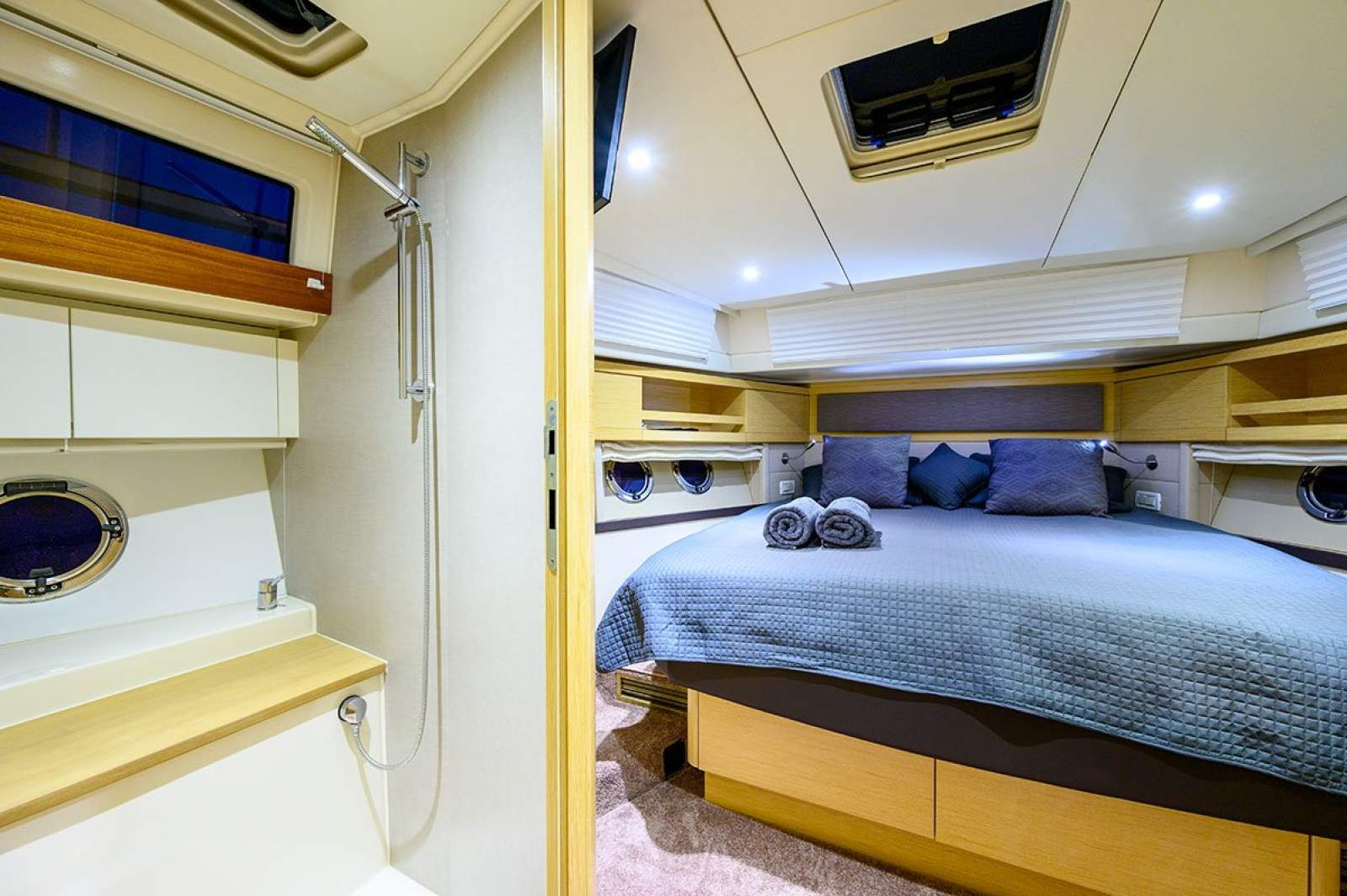 Ensuites onboard, Owner's cabin, Guest cabin and Hot/cold rear deck shower