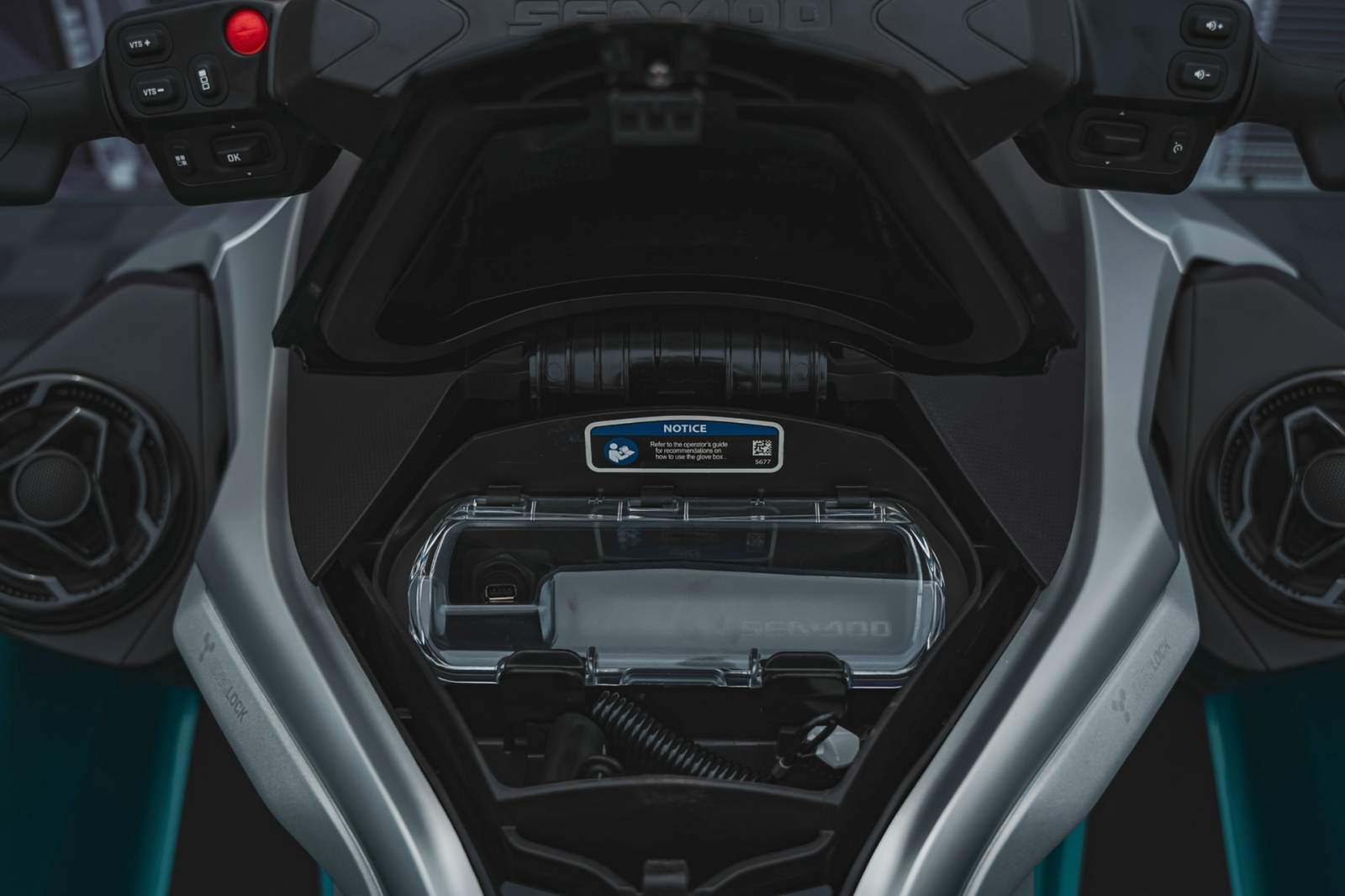 STORAGE - All your gear within arm's reach thanks to a 25.3 US gal (96 L) front storage area, easily accessible from a seated position. Simply raise the handlebars to access all the essentials for the day's adventures. A watertight compartment with integrated USB port allows your devices, to stay charged - snug in an impact-absorbing, watertight cradle.