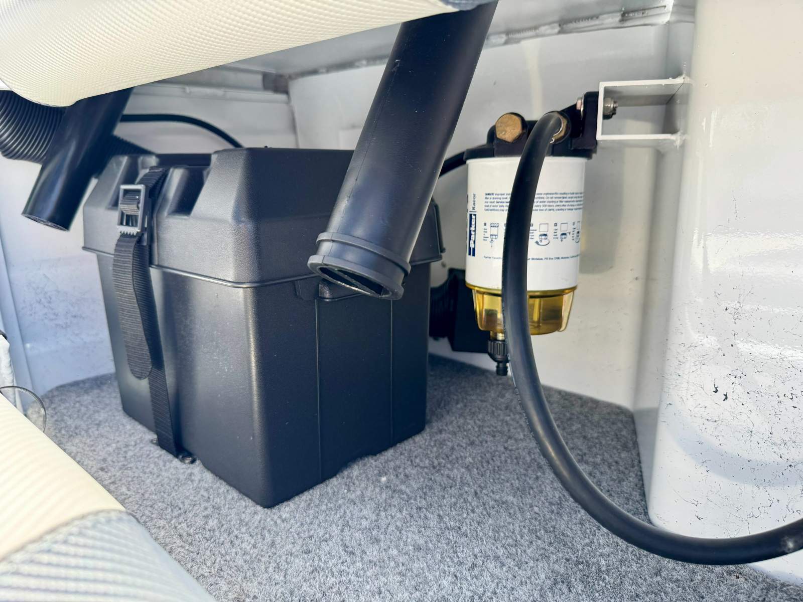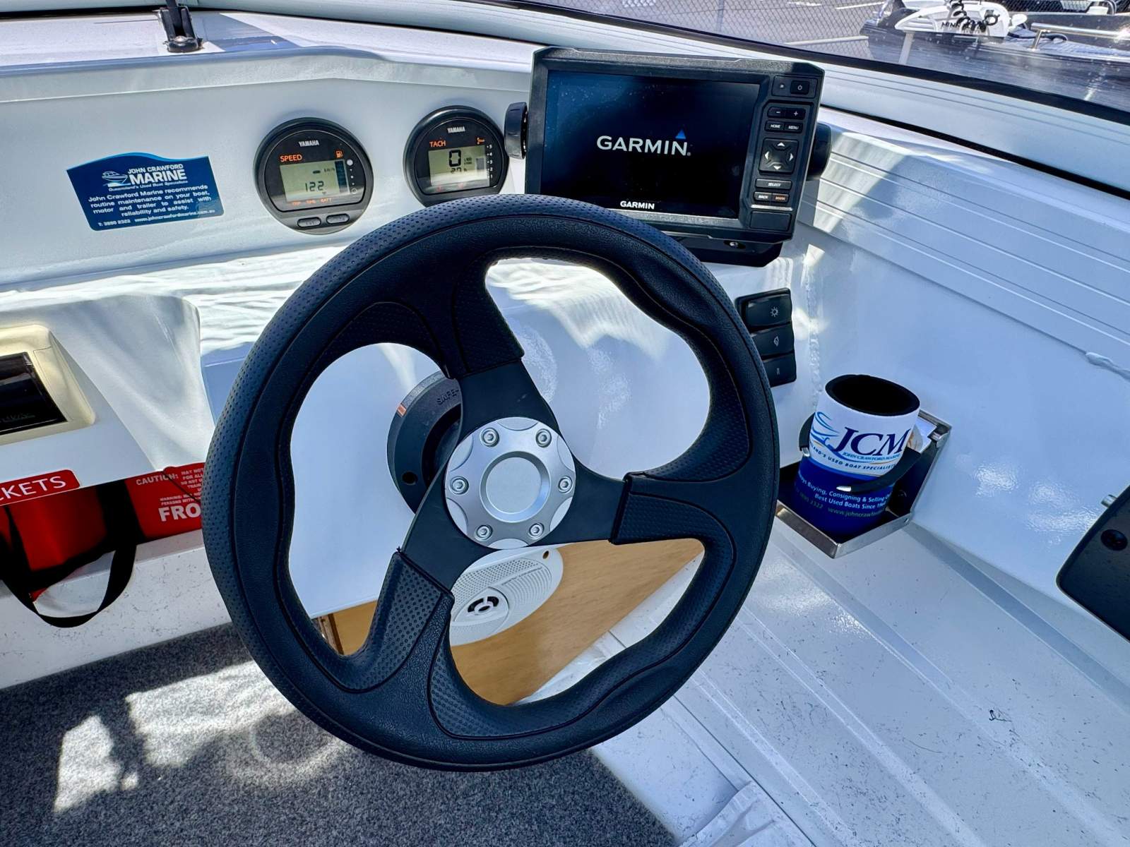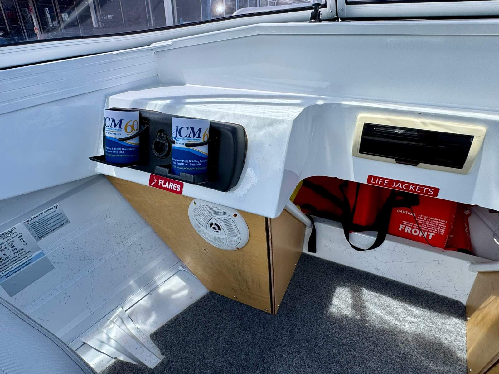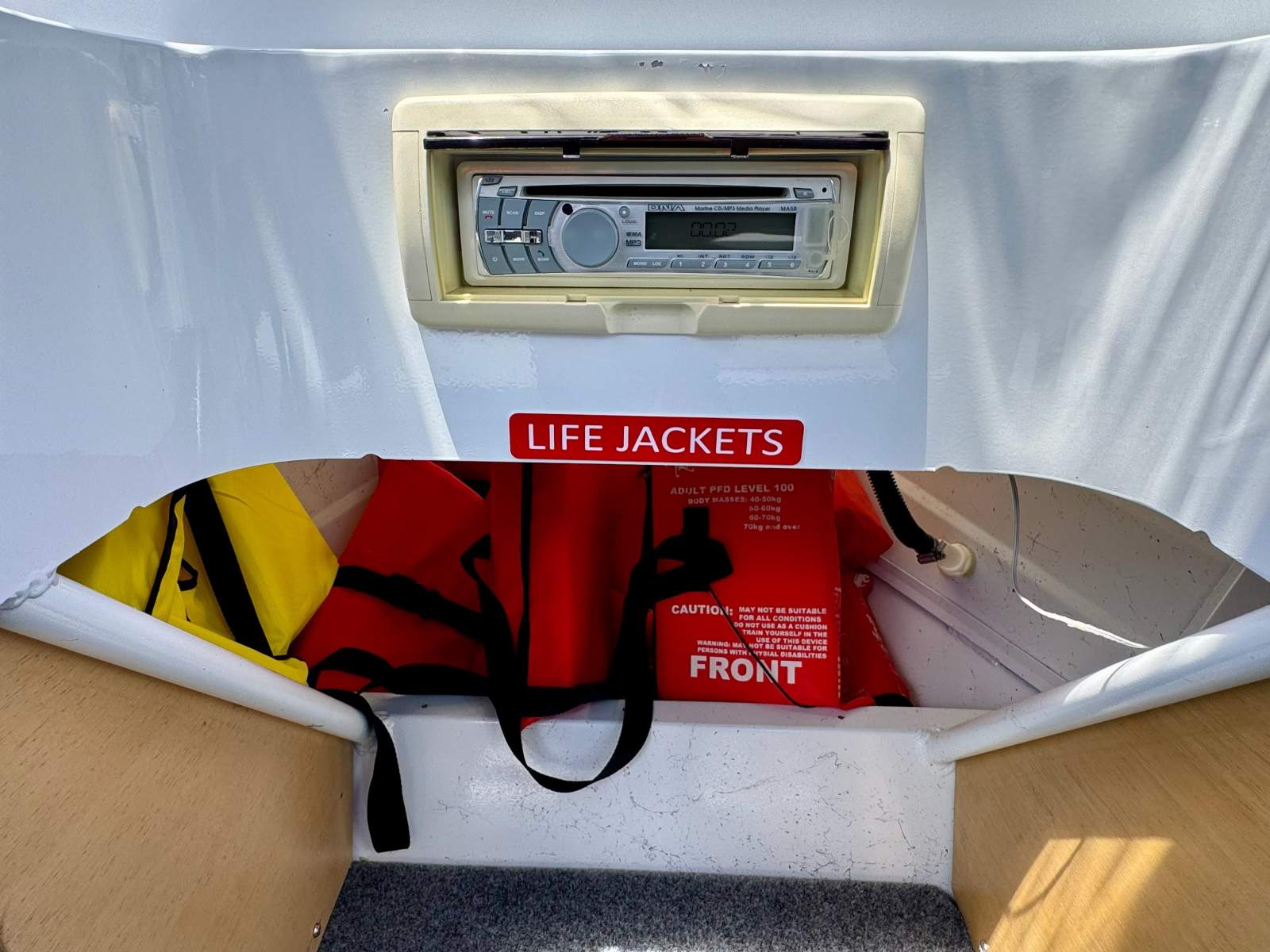In the dash, two Yamaha genuine digital engine gauges provide the data and stats, and above the dash a quality Garmin Echomap Plus 65CV proudly sits. This unit has high-definition screen making the finding of fish a much easier affair and this is linked to a good quality Garmin GT24 transducer. For that like their tunes whilst afloat, a stereo and 2 speakers have been installed.