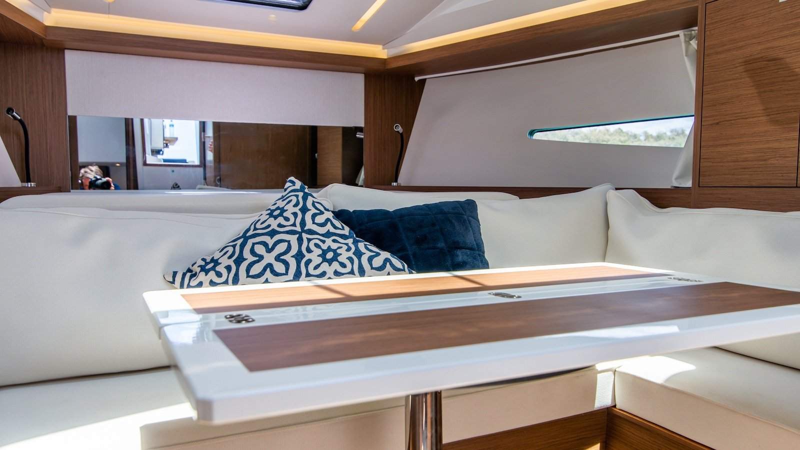 The lower saloon offers a smart dinette with a table that stows neatly under the floor, while the well-appointed galley and starboard bathroom complete a layout that feels far larger than her 33-foot length suggests. Rich walnut cabinetry from the upgraded interior package adds warmth and sophistication throughout.